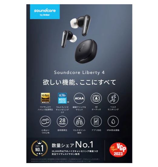 Soundcore Liberty 4、充電ケース、イヤーチップ (4種類) 、USB-C & USB-A ケーブル、クイックスタートガイド、安全マニュアル、18ヶ月保証 + 6ヶ月 (Anker Japan 公式サイト会員登録後) 、カスタマーサポート