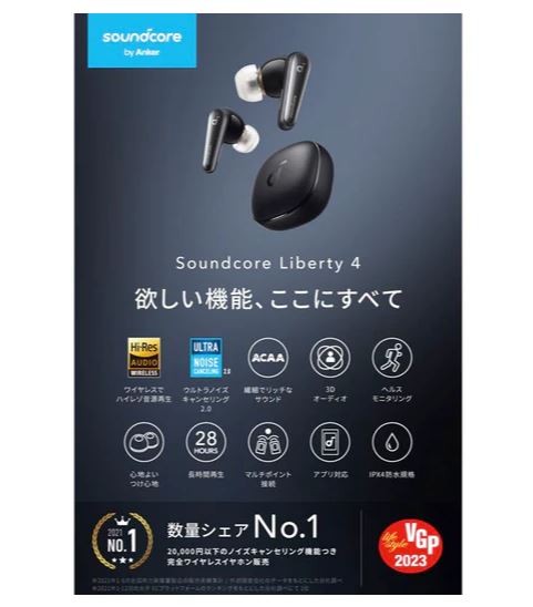 Soundcore Liberty 4、充電ケース、イヤーチップ (4種類) 、USB-C & USB-A ケーブル、クイックスタートガイド、安全マニュアル、18ヶ月保証 + 6ヶ月 (Anker Japan 公式サイト会員登録後) 、カスタマーサポート