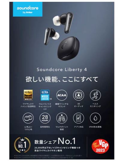 Soundcore Liberty 4、充電ケース、イヤーチップ (4種類) 、USB-C & USB-A ケーブル、クイックスタートガイド、安全マニュアル、18ヶ月保証 + 6ヶ月 (Anker Japan 公式サイト会員登録後) 、カスタマーサポート