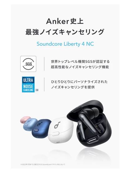 Soundcore Liberty 4 NC、充電ケース、イヤーチップ (5種) 、USB-C & USB-A ケーブル、クイックスタートガイド、安全マニュアル、18ヶ月保証 + 6ヶ月 (Anker Japan 公式サイト会員登録後) 、カスタマーサポート