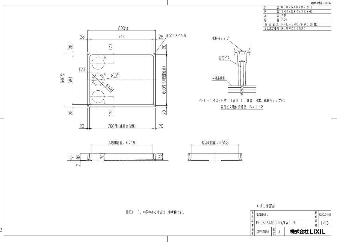 PF-8064AC_FW1-BL 洗濯機パン LIXIL INAX リクシル イナックス