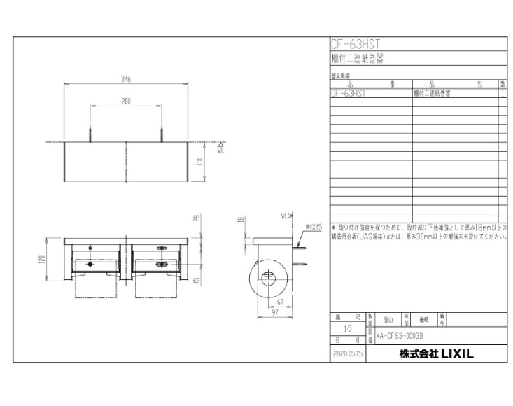 CF-63HST 棚付ワンタッチ式 2連紙巻器(高耐荷重タイプ) LIXIL INAX リクシル イナックス